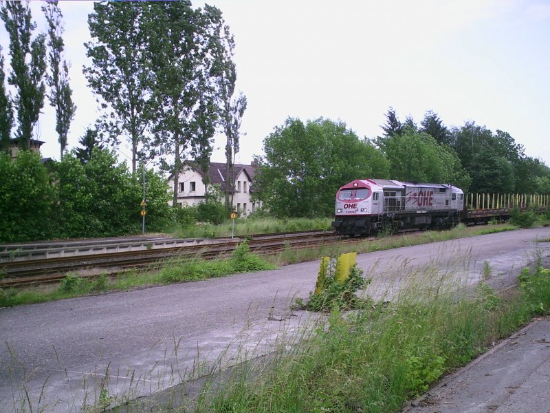 OHE 330092 "Red Tiger" mit einem Holzzug aus Rostock bei der druchfahrt von Güstrow. 14.7.06