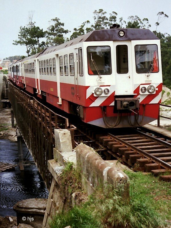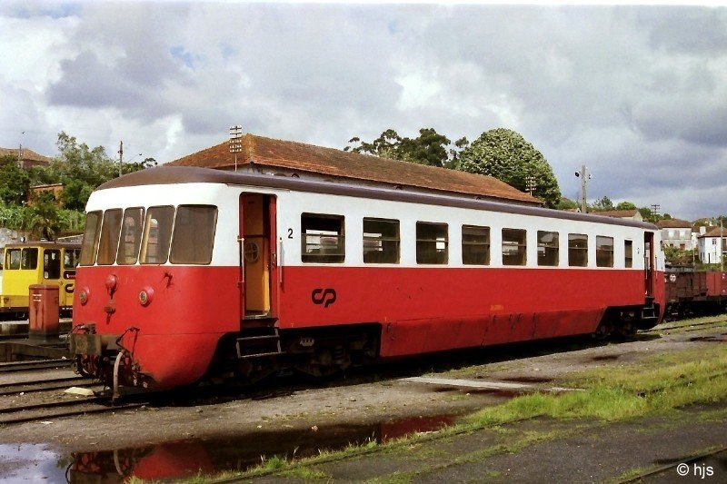 1955 lieferte Allan in Rotterdam zehn dieselelektrische Triebwagen der BR 9300 an die CP. Die Fahrzeuge haben die rundlichen Formen der 1950-er Jahre, wie wir sie z.B. vom VT08 und ETA 175 kennen. Ursprünglich waren die Wagen dunkelblau mit dunkelroten Zierstreifen. Das Bild zeigt Triebwagen 9308 in Sernada do Vouga (17. Mai 1988).