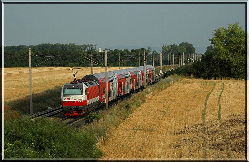 Die ehemalige CAT Lok 1014 005 (City Airport Train) schiebt am 23.7.2006 ihren E 7629 von Wien nach Bratislava. Die Aufnahme entstand zwischen Himberg und Gramatneusiedl.