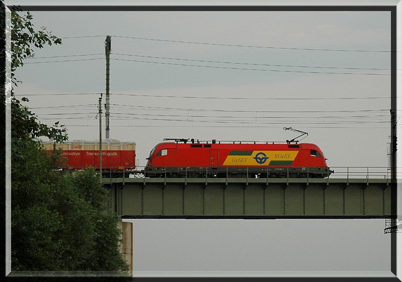 Die von den ÖBB an die GySEV vermietete 1116 061-1 überquert am 21.7.2006 im Bereich Wien Lobau die Donau.