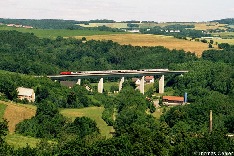 Eine 101 zieht am 16.07.06 den IC 2064 über den ersten der beiden Hetzdorfer Neubau-Viadukte.