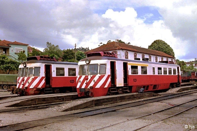 Im Bahnhof Sernada do Vouga warten die Triebwagen 9308 (links) und 9305 (rechts) auf die Abfahrt nach Espinho bzw. Aveiro. Während sich 9308 noch weitgehend im Lieferzustand präsentiert, wurde 9305 bereits einer Modernisierung unterzogen, erkennbar an der geänderten Teilung der Frontfenster (17. Mai 1988).