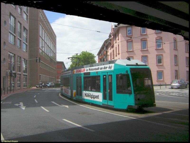 Zwischen den Haltestellen Nauheimer Straße und Kuhwaldstraße unterquert die Strecke der Rebstockstraßenbahn die Bahnbrücke am Westbahnhof. Als R-Triebwagen 012 am 01.06.2006 auf dem 3. Zug der Linie 17 zum Rebstockbad die Brücke erreichte, hatte die DB AG leider kein Einsehen mit den Fotografen, in dem Augenblick querte kein Zug die Brücke.