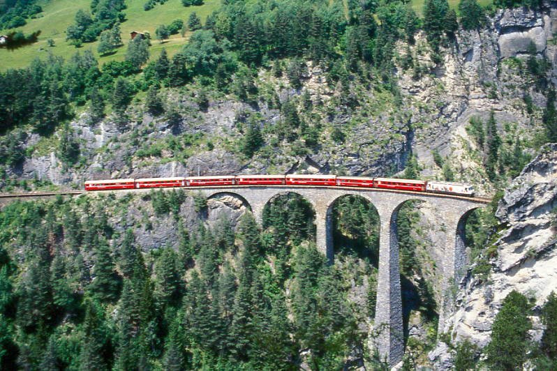 RhB Schnelllzug 545 von Chur nach St.Moritz am 04.07.1999 auf Landwasser-Viadukt zwischen Alvaneu und Filisur mit E-Lok Ge 4/4III 649 - B - D - 3x B - 2x A. Hinweis: gescanntes Dia