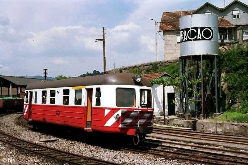 Triebwagen 9102 (NOHAB 1948) beginnt in Livração seine Fahrt nach Arco de Baúlhe (10. Mai 1988). Seit 1989 ist die Strecke nur noch bis Amarante in Betrieb.
