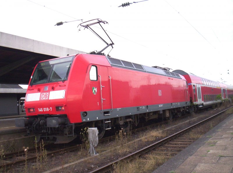 146 018-7 am Ende des RE 1 nach Aachen hier im Startbahnhof Hamm(Westf). 30.07.2006