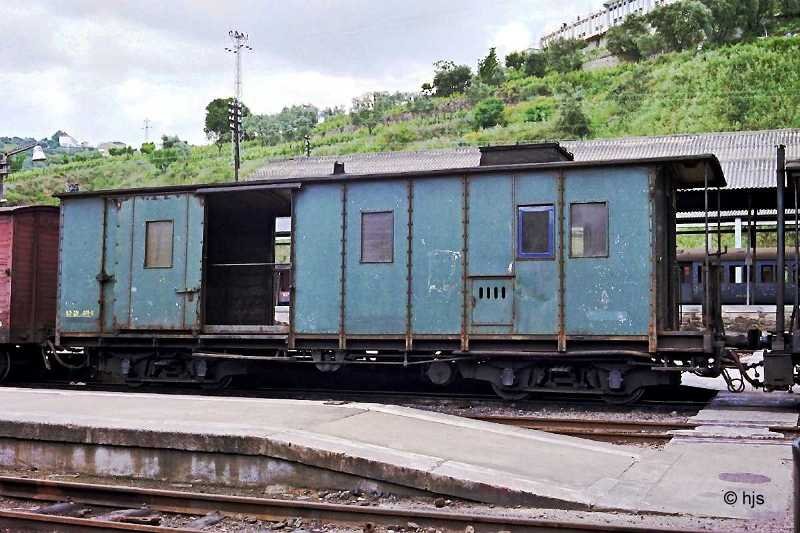 Triebzug 9718/9717 in Régua (10. Mai 1988). Die Triebzüge der BR 9700 waren zwar eigentlich vierteilig, die CP setzte sie aber meist nur drei- oder gar zweiteilig ein. Die überzähligen Mittelwagen dienten als Ersatzteilspender. Einige der Untergestelle fanden beim Bau der LRV 2000 (BR 9500) Verwendung.
