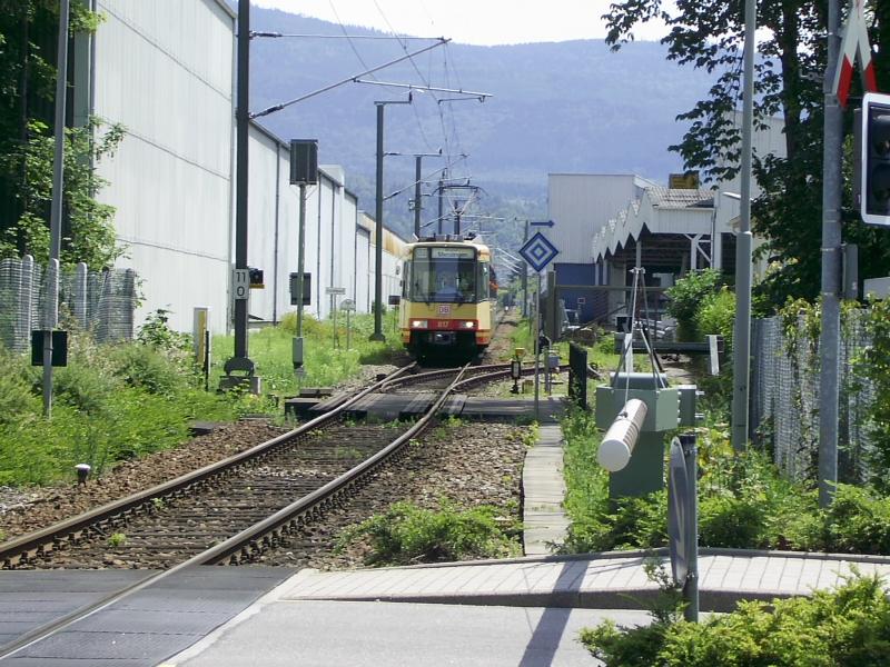 Zweisystem-Stadtbahnwagen 487 des Karlsruher Verkehrsvrbundes fährt am 23.05.2006 als Linie S31 in Richtung Freudenstadt Hbf in den Bahnhof von Rastatt ein.