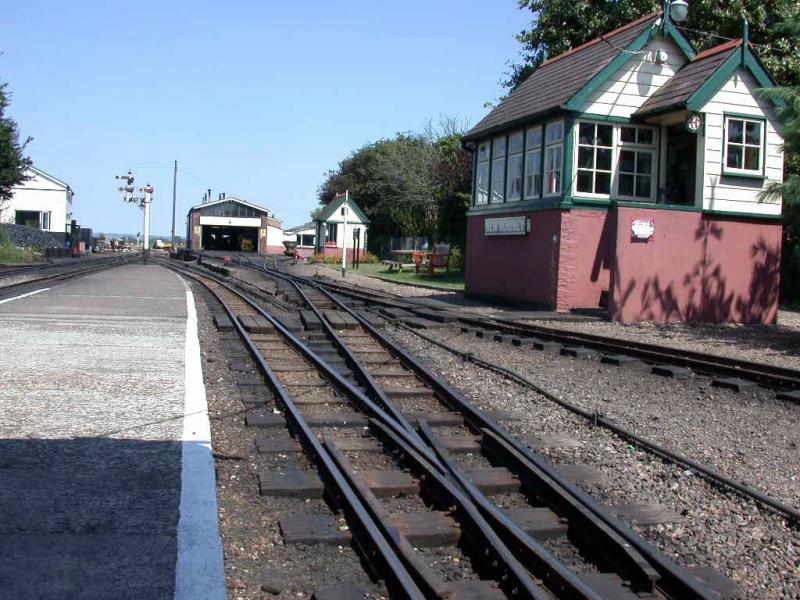 Stellwerk, Wasserkran, Signale und Überführungen sind alle eine Spur kleiner als bei einer Vollbahn. (20.07.2001)