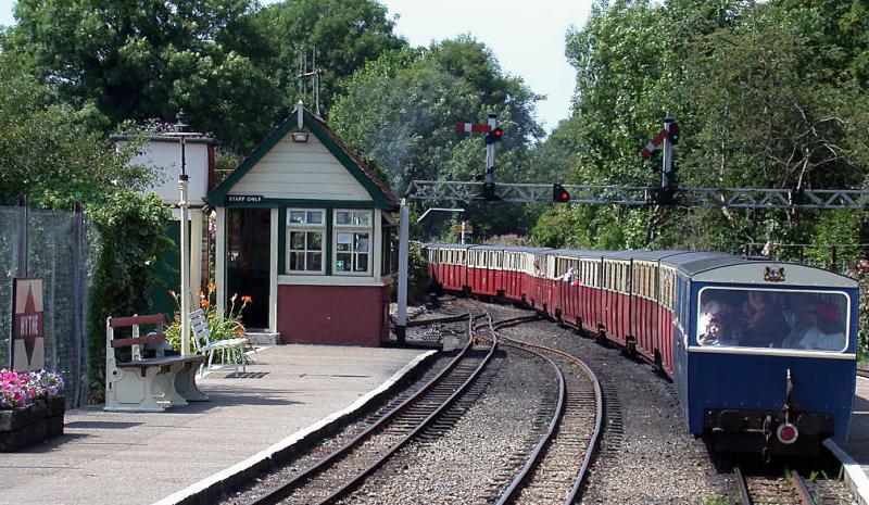 Ausgangspunkt im Norden ist Hythe. Diese kleinste öffentliche Eisenbahn der Welt wurde 1927 eröffnet. Sie ist 23km lang, zum Teil doppelspurig und hat eine Spurweite von lediglich 381mm. Die im Massstab 1:3 gebauten Schnellzugdampfloks haben ihre Vorbilder in England, Deutschland und den USA. Die Züge können bis zu 200 Passagiere befördern und haben eine stattliche Länge, wie dieser ausfahrende Zug in Hythe zeigt. (20.07.2001)