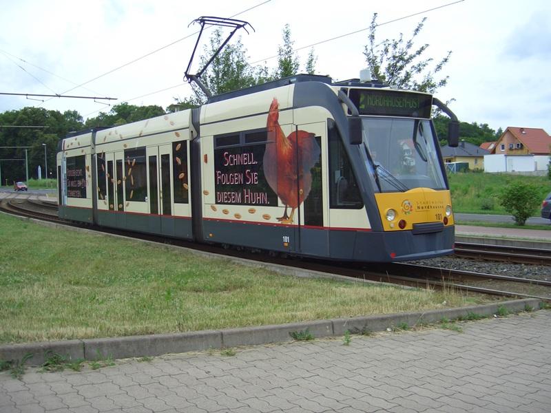 TW 81 kam 1992 zu den Nordhäuser Stadtwerken und wurde 1998/99 mit einem neuen, visuellen und akustischen Fahrgastinformationssystem, sowie neuer Inneneinrichtung modernisiert. Hier erreicht er gleich die Haltestelle Rückertstraße.