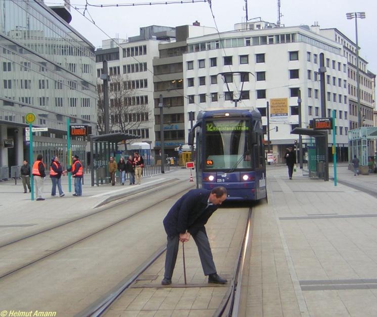 Hier muß das Personal noch Handarbeit leisten: Der Fahrer des S-Triebwagens 235 auf dem 4. Zug der Linie 12 nach Schwanheim beim Umstellen der Rückfallweiche des Gleiswechsels am 26.02.2006 an der Haltestelle Willy-Brandt-Platz, wo die Straßenbahn an diesem Tag aufgrund des Faschingsumzugs außerplänmäßig Endstation hatte.