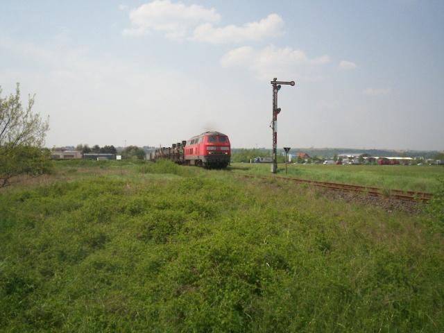 Der Bewuchs zeigt, dass nichts mehr geht. Der Abzug der US-Armee bescherte der Unteren Steigerwaldbahn von Schweinfurt nach Kitzingen-Etwashausen am 8. Mai 2006 jedoch den Einsatz von 225 101 und 225 803. Nach den erforderlichen Rangierarbeiten fuhren beide Maschinen am Nachmittag mit je einem Zug zurück nach Schweinfurt.