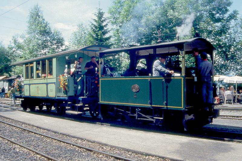 BC Museumsbahn Dampfzug 433 von Chaulin nach Chamby am 31.05.1993 Ausfahrt Depot Chaulin mit exTN C4 121 - Dampflok exFP G 2/2 4. Hinweis: Zug geschoben, Dampflok von Rimini/Italien.