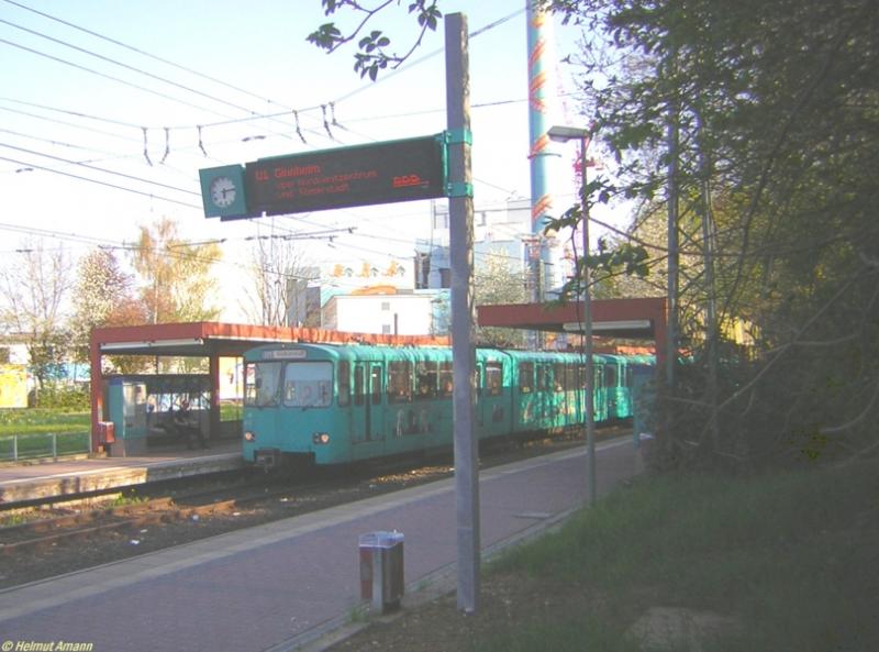 Die Station Heddernheimer Landstraße an der Linie U1 vom Südbahnhof nach Ginnheim befindet sich im Modernisierungsprogramm der Verkehrsgesellschaft Frankfurt (VGF) für das Jahr 2006, das hat sie aber auch bitter nötig, wie der Zustand der Wartehalle zeigt. Immerhin gibt es hier schon die dynamische Fahrgastinformation, unter der auf dem Bahnsteig nach Ginnheim stehenden fuhr am 22.04.2006 der 2. Zug der U1 zum Südbahnhof mit den U2h-Triebwagen 321, 313 und 403 ein.
