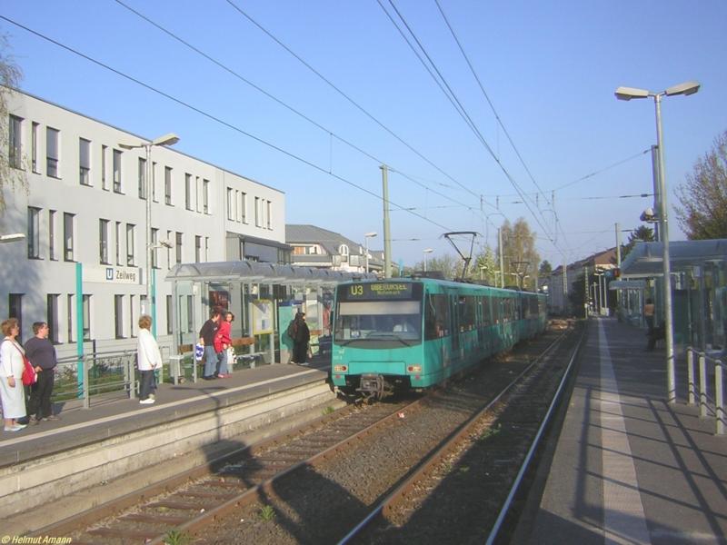Die Station Zeilweg ist die letzte, die von den Linien U3 nach Oberursel und U1 nach Ginnheim gemeinsam angefahren wird, danach teilen sich die Strecken. Diese Aufnahme vom 22.04.2006 zeigt den 6. Zug der U3 nach Oberursel-Hohemark mit den U4-Triebwagen 535 und 533 bei der Einfahrt in die Station.
