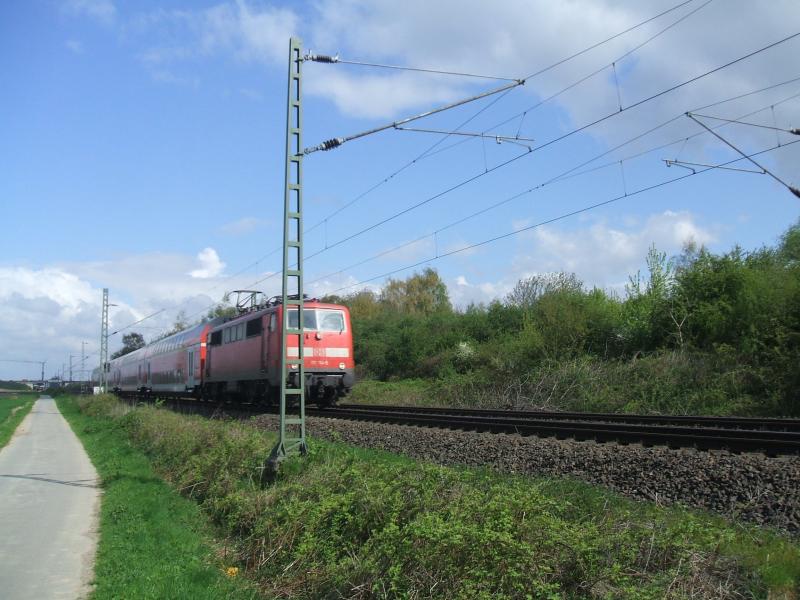 Hier ist 111 114 auf dem Weg zum Bahnhof Meerbusch Osterrath. Vor etwa 15 Minuten began ihr Lauf in Krefeld Hbf mit dem RE 7, der nun nach Münster (Westfalen)über Köln, Wuppertal und Hamm fährt. Das Bild wurde am 10 Mai 2006 erstellt.