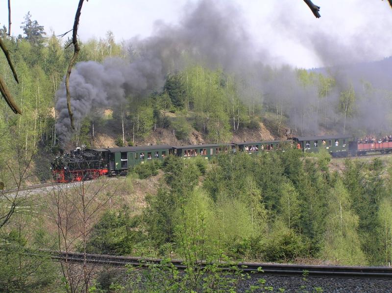 Ausfahrt von 50 3576 der Nassauischen Touristikbahn (NTB) am 17.04.2006 aus Bad Schwalbach in Richtung Wiesbaden-Dotzheim. Das Wetter war am Ostermontag leider nicht besonders, aber dafür war aufgrund der kühlen Temperatur die Dampfbildung sehr schön. Wie bei jedem dampflokbespannten Zug, hingen die Enthusiasten und Fotografen aus den Fenstern, um Bilder zu machen oder einfach das Erlebnis Dampflok zu genießen.