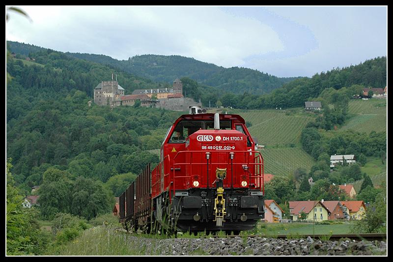 1700.1 der GKB auf der "Leibenfelder Höhe" kurz nach dem Bahnhof Deutschlandsberg am 26.5.2006. Im Hintergrund ist die Burg Deutschlandsberg zu sehen.