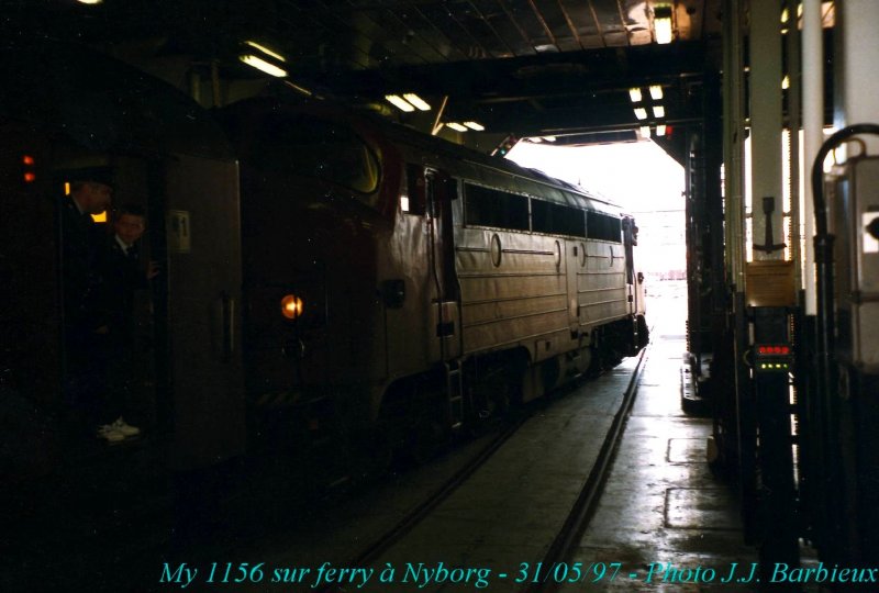 DSB - Die Lok My 1156 auf dem Fährschiff, wartet für Abfahrt zum Nyborg's Bahnhof und weiter bis Odense. Der Zug ist privat, für Dänemark's Eisenbahn Freunden. Wir sind am 31. Mai 1997, der letzte Tag für die Fähre Verbindung Korsoer - Nyborg auf dem Grossen Belt. Grosse Erinnerung ! (Foto J.J. Barbieux)
