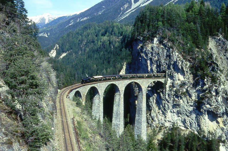 RhB Dampfzug 3562 für Verein Dampffreunde der RhB von Filisur nach Landquart am 10.05.1994 auf Landwasser-Viadukt zwischen Filisur und Alvaneu mit Dampflok G 4/5 108 - A² 1102 - B² 2060 - D² 4052I - B 2245 - B 2246 - B 2247 - B 2301 - B 2305 - Hinweis: Der Muttertags-Dampfzug hatte eine sehr große Nachfrage. Das Sitzplatzangebot in damals allen grünen historischen Fahrzeugen reichte nicht aus, Es mussten 2 weitere rote Mitteleinstiegswagen angekuppelt werden. Zughakenlast waren 26 Achsen - Hinweis: gescanntes Dia