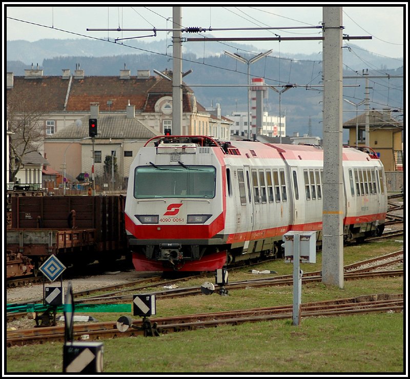 Die Triebwagen der Reihe 4090 sind die modernsten Fahrbetriebsmittel, die die Mariazellerbahn zu bieten hat. Bei meinem Ausflung am 1.4.2006 war leider keiner dieser Fahrzeuge im Planeinsatz. So blieb mir nur die Möglichkeit, vom Zug aus ein Foto vom 4090 001 zu machen, der in St. Pölten Alpenbahnhof abgestellt war.