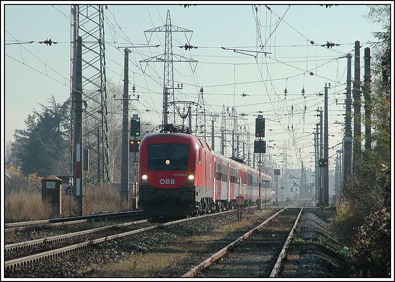 Zur Freude der österreichischen Eisenbahnfotografen hat 1142 566 nicht ihren ursprünglichen blutorangen Lack verloren. Allerdings erhielt sie statt dem Pflantsch die ÖBB Wortmarke. SPR 1914 "Mürztal-Sprinter" am 24.11.2006 von Graz auf dem Weg nach Mürzzuschlag, aufgenommen in Graz-Gösting.