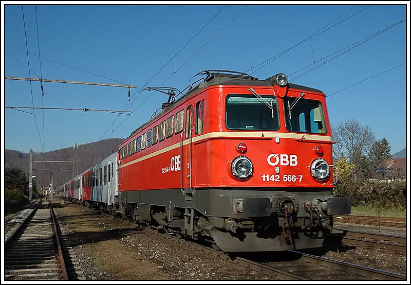 Zur Freude der österreichischen Eisenbahnfotografen hat 1142 566 nicht ihren ursprünglichen blutorangen Lack verloren. Allerdings erhielt sie statt dem Pflantsch die ÖBB Wortmarke. SPR 1914  Mürztal-Sprinter  am 24.11.2006 von Graz auf dem Weg nach Mürzzuschlag, aufgenommen in Graz-Gösting.