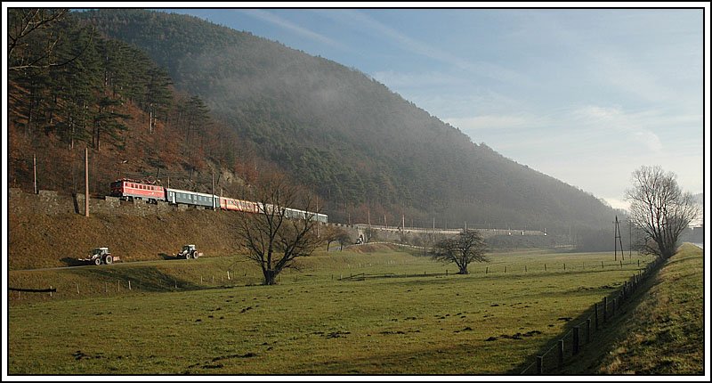 Morgenstimmung kurz nach der Haltestelle Schlöglmühl am 25.11.2006. OEC 531  IT Campus Kärnten  von Wien nach Lienz in Osttirol mit Kurswagen nach Sillian. Auch wenn man es auf dieser Aufnahme nicht sehen kann - der Zug wurde von 1016 046 bespannt. Eigentlich beginnt die Semmeringbahn ja schon in Gloggnitz, und endet in Mürzzuschlag. Daher werde ich in Zukunft Bilder, die in diesem Streckenabschnitt aufgenommen wurden, auch in die Kategorie Semmeringbahn einordnen. Der geplante Semmeringbasistunnel (falls er je gebaut wird) soll dann ja auch in Gloggnitz beginnen, und in Mürzzuschlag enden.