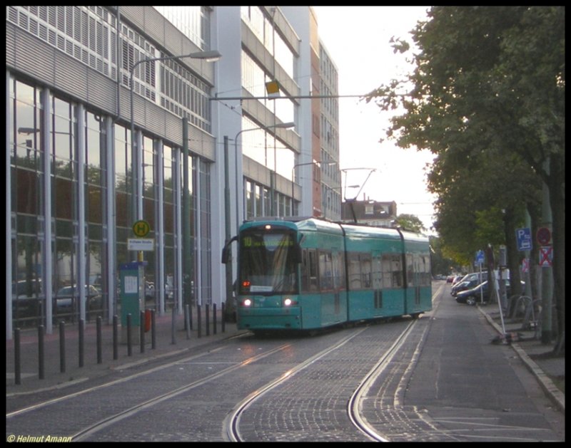 Der S-Triebwagen 250 verließ am 18.08.2006 auf dem 7. Zug der Linie 10 den eingleisigen Abschnitt in der Rebstöcker Straße und schlängelte sich anschließend über die Weiche kurz vor der Haltestelle Krifteler Straße auf das Gleis in Fahrtrichtung Zoo.