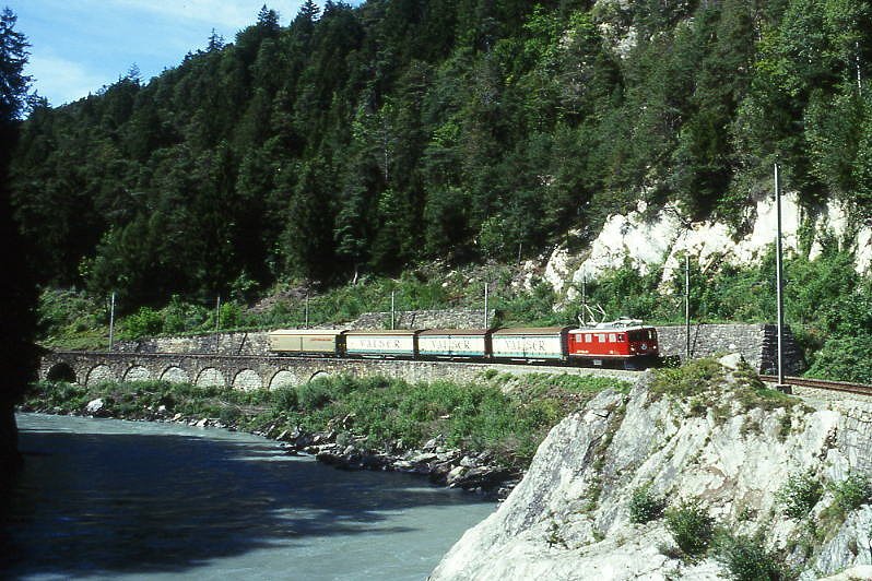 RhB Güterzug 5252 von Ilanz nach Landquart am 01.09.1997 bei der Hochwassermarke zwischen Trin und Reichenau mit E-Lok Ge 4/4I 608 - Haikv 5101 - Haikv 5104 - Haikv 5124 - Haiv 5136 - Hinweis: Valserwasserzug, Lok noch mit Scherenpantografen, gescanntes Dia