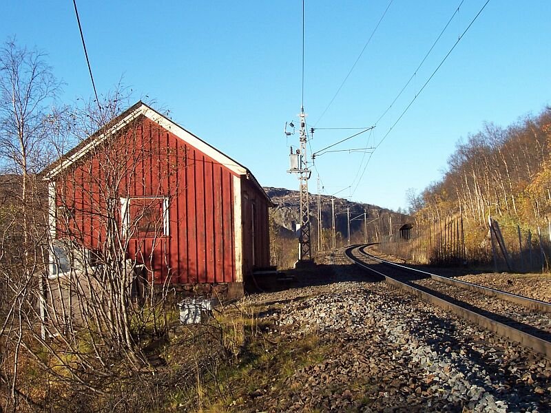 Der Bahnhof Katterat liegt zwischen zwei Tunneln, dieses ist der Tunnel in Richtung Norden nach Narvik, der rechte Tunnel ist nicht mehr in Betrieb, das Gleis teilweise abgebaut. Dafür wurde ein neuer Tunnel gebaut, der den Bahnhof umgeht und durch den die Erzzüge fahren, aufgenommen im März 2006