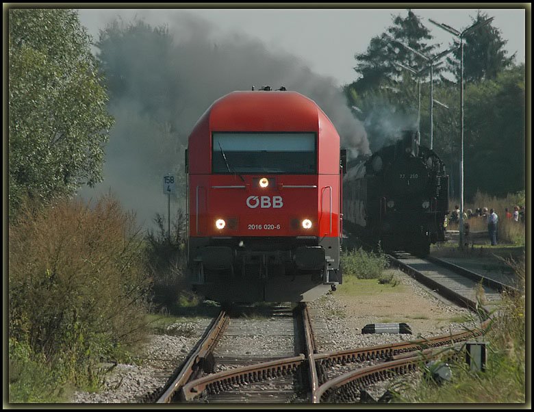 In Haugsdorf musste der IGE-Dampfsonderzug R 16632 am 22.9.2006 die Kreuzung mit dem Güterzug aus Pernersdorf-Wulzeshofen bespannt von 2016 020 abwarten.