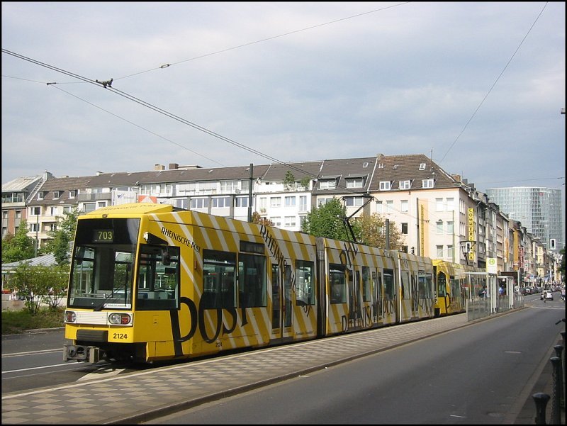 Straßenbahn-Haltestelle Kirchplatz in Düsseldorf am 23.09.2006. Ein Zug der Linie 703 mit zwei Niederflur-Triebwagen hat gerade gehalten. Beide Triebwagen tragen die gleiche auffällige Werbung für eine der großen Tageszeitungen der Region.