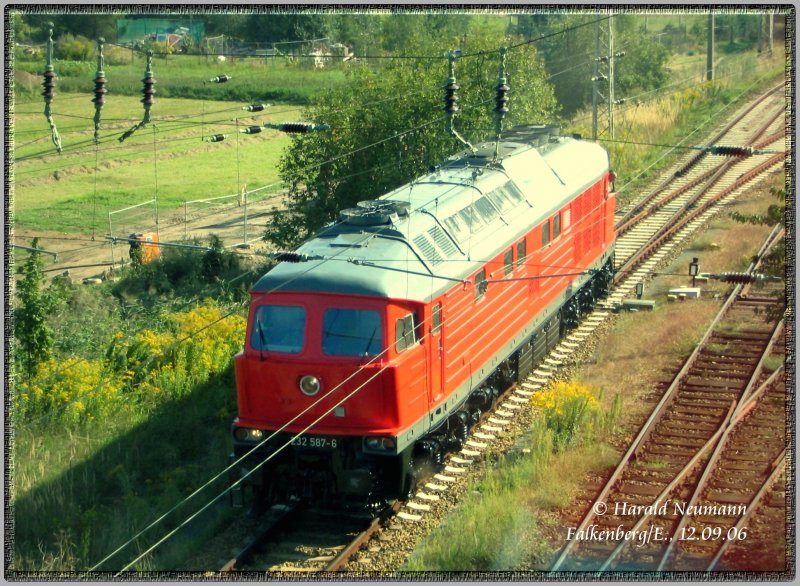 232 587 frisch lackiert (bis jetzt in der roten Grundfarbe) auf Probefahrt im Bf Falkenberg(Elster), 12.09.06
