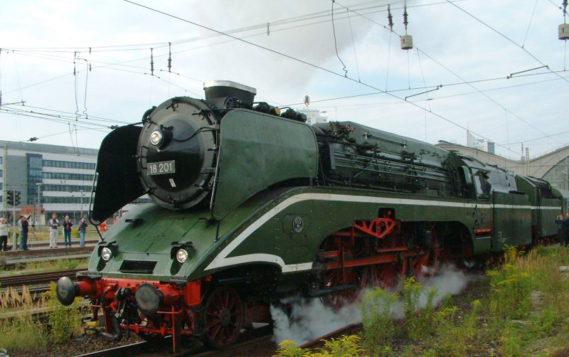 Lok 18 201 am 12.08.2006 um 08.18Uhr mit Sonderzug nach Warnemünde bei der Ausfahrt aus Leipzig/HBf