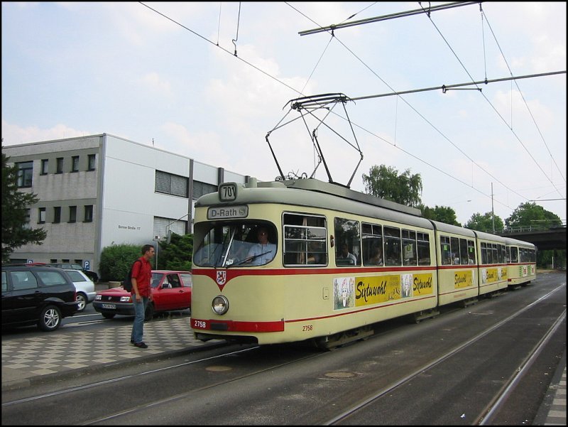 Straßenbahn-Triebwagen 2758, eingesetzt auf der Linie 701 in Richtung Düsseldorf-Rath, steht am 25.07.2006 mit seinem (antriebslosen) Beiwagen 1655 an der Haltetelle Niederheider Straße in Düsseldorf-Holthausen.