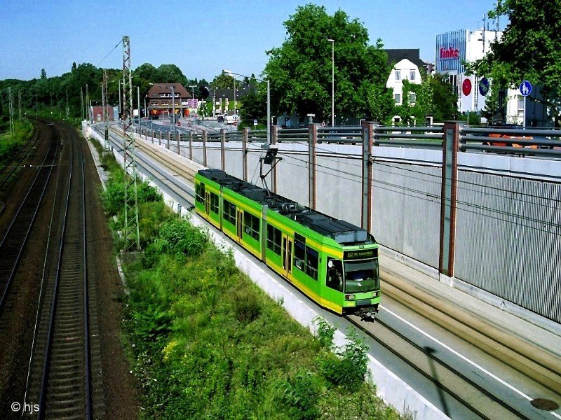 STOAG-Tw 206 von der Endstelle Neumarkt kommend unterwegs in Richtung Mülheim (21. September 2006). Das Teilstück Sterkrade Bf - Neumarkt wurde erst im Herbst 2004 in Betrieb genommen. Links die DB-Strecke Oberhausen - Emmerich.