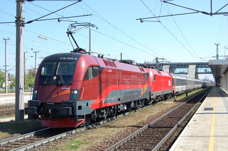 Der österr. Paradereisezug " Transalpin " ist öfters mit zwei Ochsen bespannt. Am 22.04.2007 waren es die neugestaltete Railjet 1116 200 und die 1116 131 die den EC 162 beförderten. Zu sehen ist der Zug wie er gerade Wels verlässt.