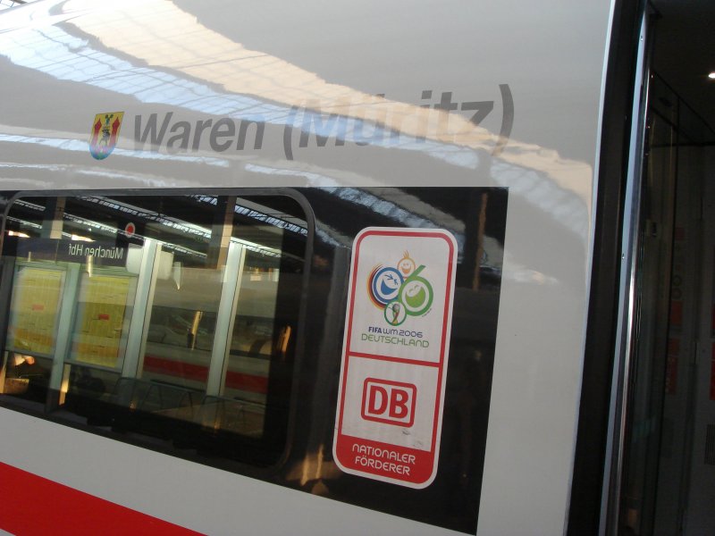 Hier steht ein ICE-T 7 teilig im Münchner Hauptbahnhof. Der Zug kommt gerade aus Hamburg-Altona über Berlin und Leipzig. An der Seitenscheibe befindet sich das WM Logo in Kooperation mit der Deutschen Bahn.