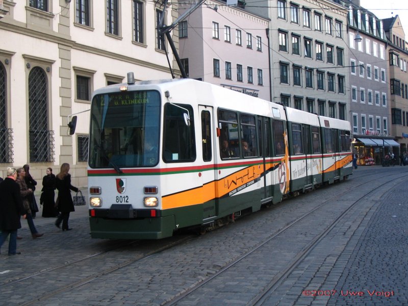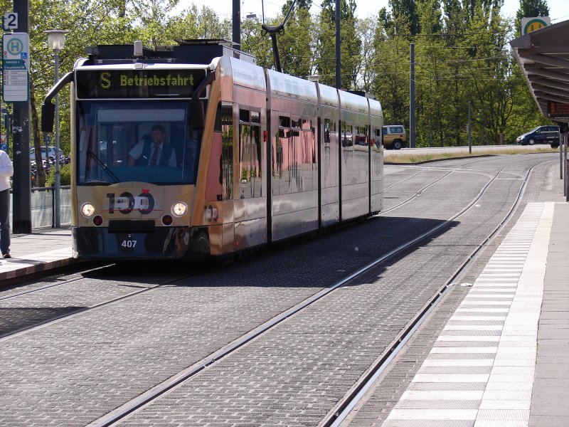 (Bild1)Tram Siemens Combino (Zug 407) mit Werbung 100 Jahre Straßenbahn in Potsdam. Aufgenommen am 29.04.07
