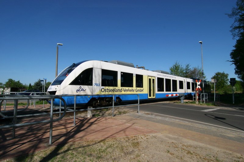 Ostseelandverkehr mit Triebwagen 703 kommt als Sonderzug von Zarrentin zurück nach Hagenow Stadt gefahren. Hier am Überweg Königstrasse. 29.04.2007