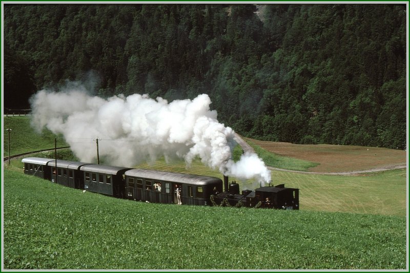 Bt 52 und Be 4/4 12 nähern sich Apples (8. Mai 1996). Hinten im Dunst ist der Genfer See zu ahnen.