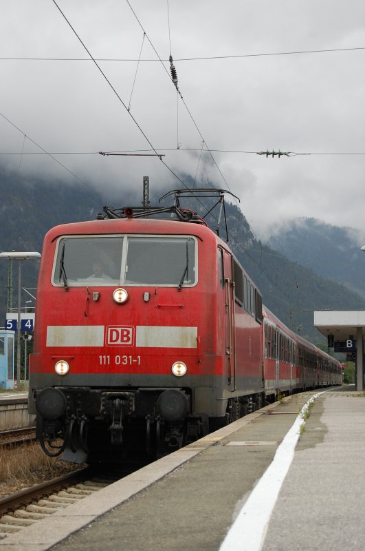 111 031-1 zieht am 09.08.07 einen RegionalExpress von München HBF nach Innsbruck, hier bei der Ausfahrt aus dem Bahnhof Garmisch-Partenkirchen.
