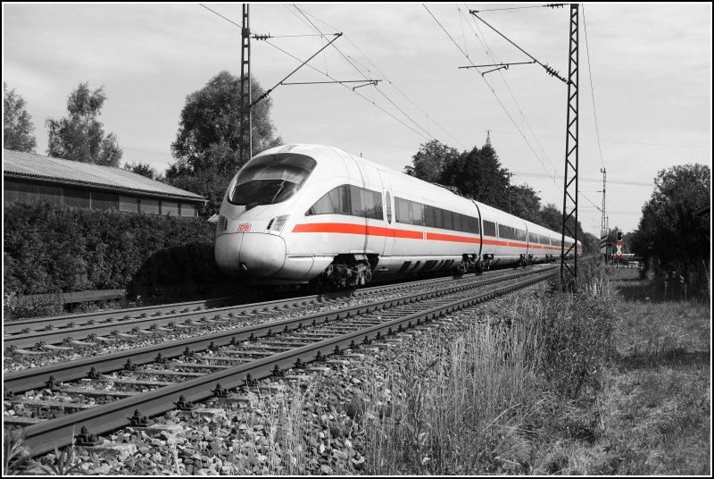 411 013 "HANSESTADT STRALSUND" fährt bei Rosenheim als ICE 562 "ST.ANTON AM ARLBERG" von Wien Westbahnhof nach Bregenz. Aufnahme diesmal in S/W-Fokus. (29.06.07)
