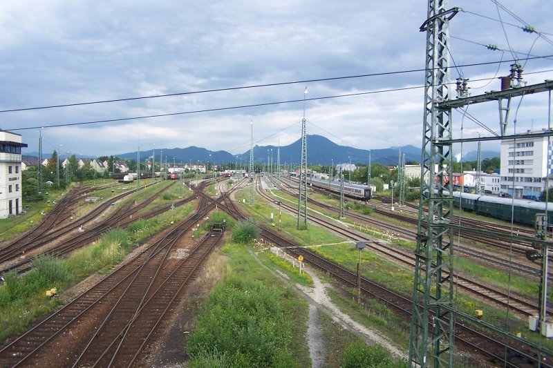 Der Bahnhof Freilassing von der Fußgängerbrücke aus. Hier konnte man in früheren Jahren die E60 beim rangieren beobachten. Auch der kleine Ablaufberg ist verschwunden. Halblinks fast ganz hinten erkennt man eine Schneeschleuder und dort steht die E 44.502. Juli 2007