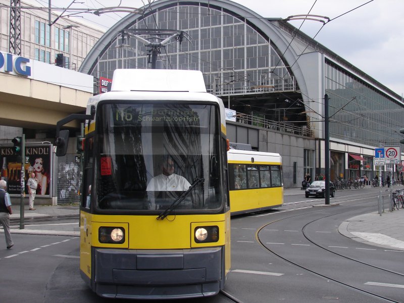 Eine Tatra auf der M4 am Alexanderplatz. In dieser Kurve unter der S-Bahnbrücke hat man immer das Gefühl, das die Stromabnehmer gleich völlig einklappen so niedrig hängt hier die Oberleitung. 15.08.2007