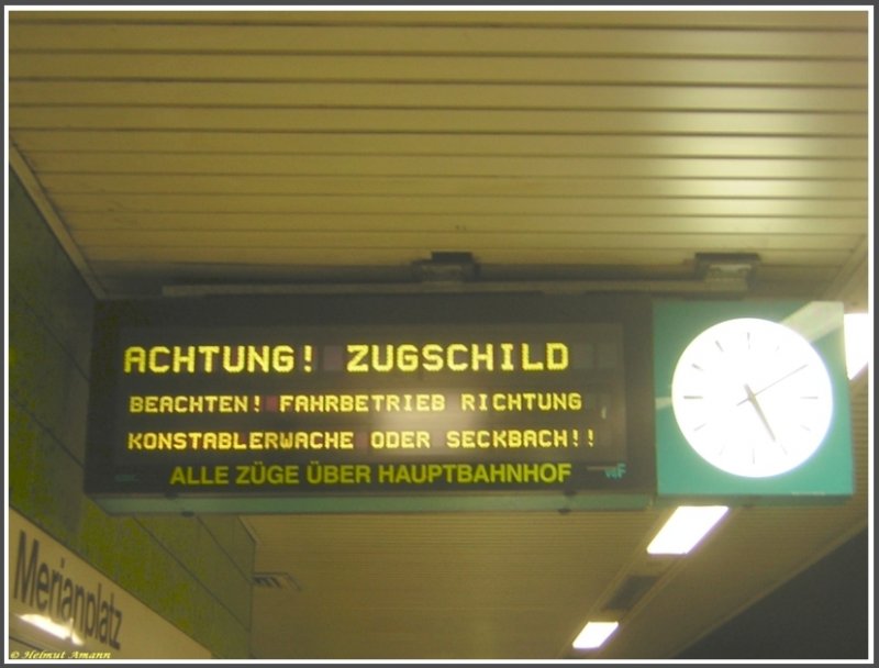 Dieser außergewöhnliche Zugzielanzeigertext hatte seinen Grund darin, daß im Zeitraum vom 28.07. bis 10.08.2007 die Linie U4 aufgrund von Gleisbauarbeiten an der Station Bornheim Mitte nur auf dem Gleis in Richtung Bockenheimer Warte verkehrte, und das auch nur als Pendelzug zwischen Bornheim Mitte und Konstablerwache. Die Aufnahme entstand am 28.07.2007 an der Station Merianplatz, wie am Stationsschild im Bild unten links zu erkennen ist.