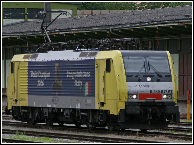 Nach der Ankunft der der "WM-Dispolok" E189 917RT am 28.06.07, wartet die Lok nun auf den nächsten Einsatz. Auf der Werbefolie ist ein bekannter Italienischer Fußballspieler abgebildet.