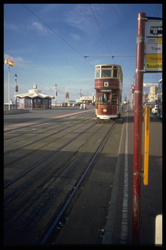 Wagen 366 der Strassenbahn in Blackpool. Es ist der einzige Strassenbahnbetrieb in Großbritannien, wo bis heute noch die typischen Doppelstockwagen verkehren. Dieses Bild ist 1996 entstanden und zeigt ein historisches Fahrzeug (wobei die normalen Fahrzeuge nicht wirklich neu sind) mit Holzaufbauten. Hinweis: eingescanntes Dia